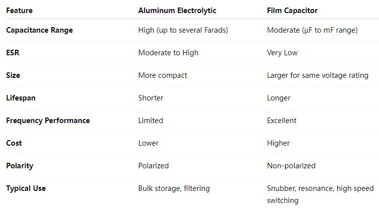 عادةً ما تحتوي المكثفات الفيلمية على ESR أقل بكثير من المكثفات الكهربائية المصنوعة من الألومنيوم، مما يجعلها مناسبة للتطبيقات عالية التردد أو منخفضة الفقد. ومع ذلك، فقد تم تصميم العديد من المكثفات الطرفية اللولبية الإلكتروليتية الحديثة بخصائص ESR محسنة لتلبية المتطلبات المتزايدة الطلب.